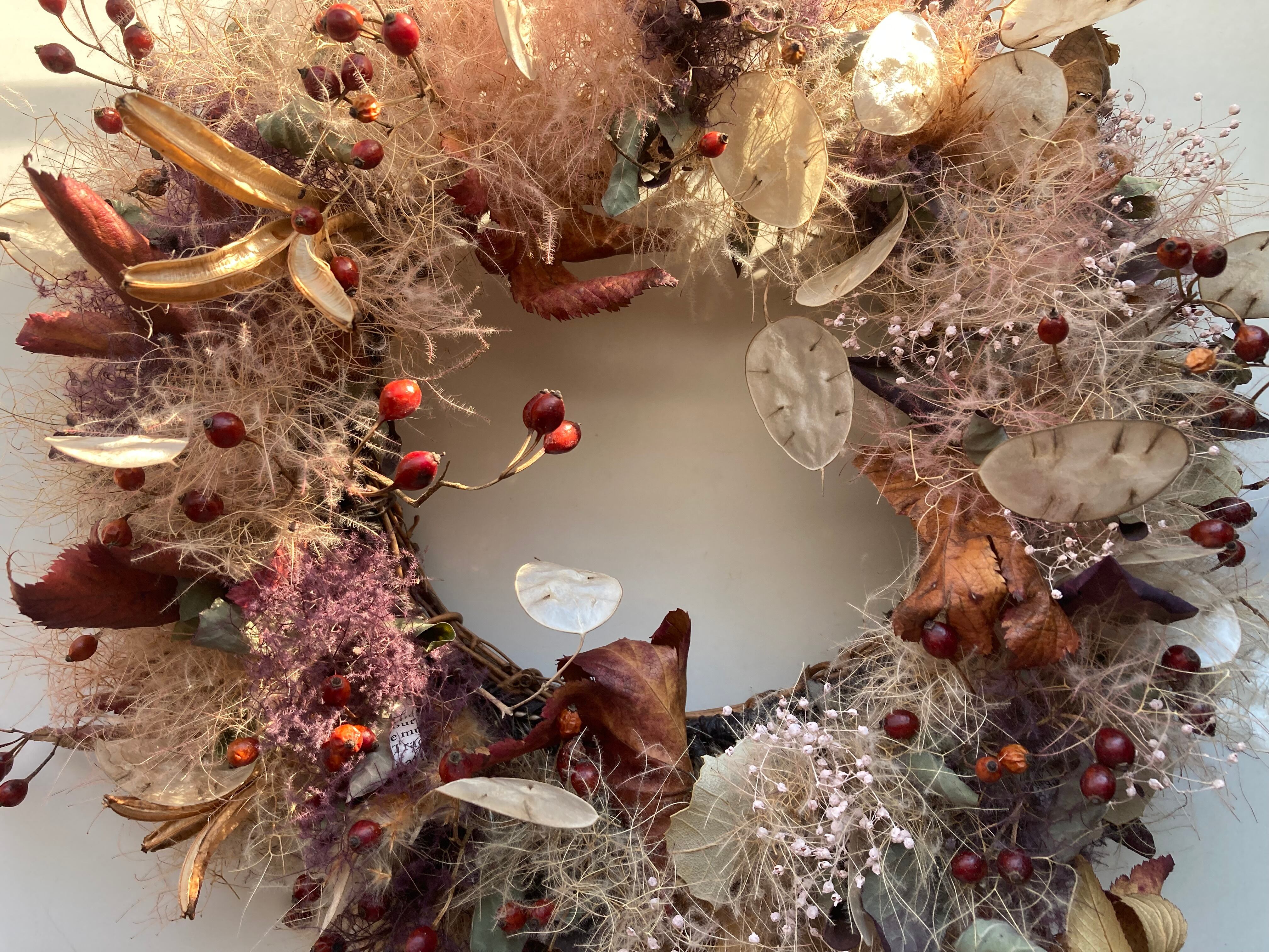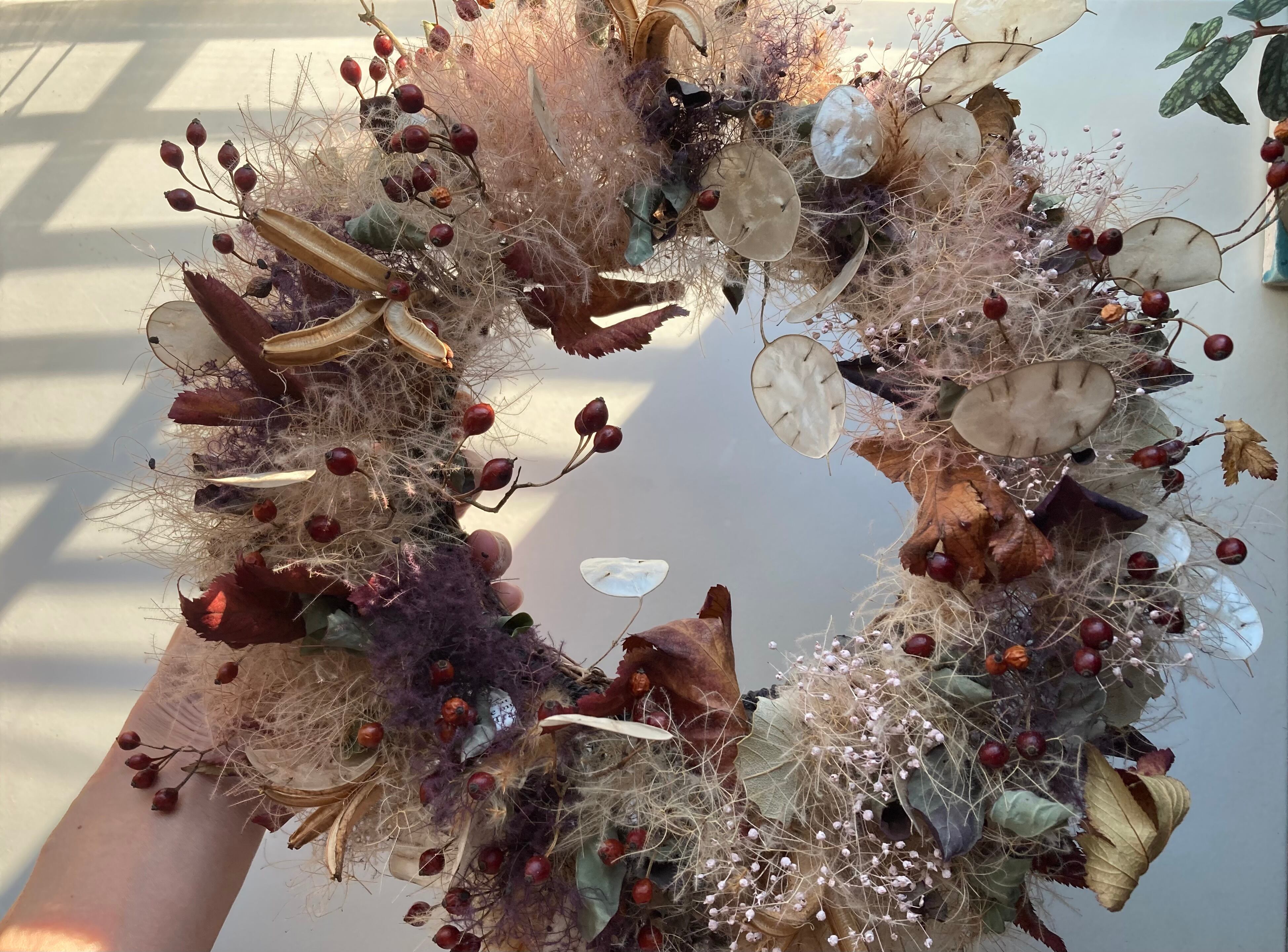 プリザーブドフラワー(一部)とドライフラワーを使ったオリジナルのリース(壁掛け)です。