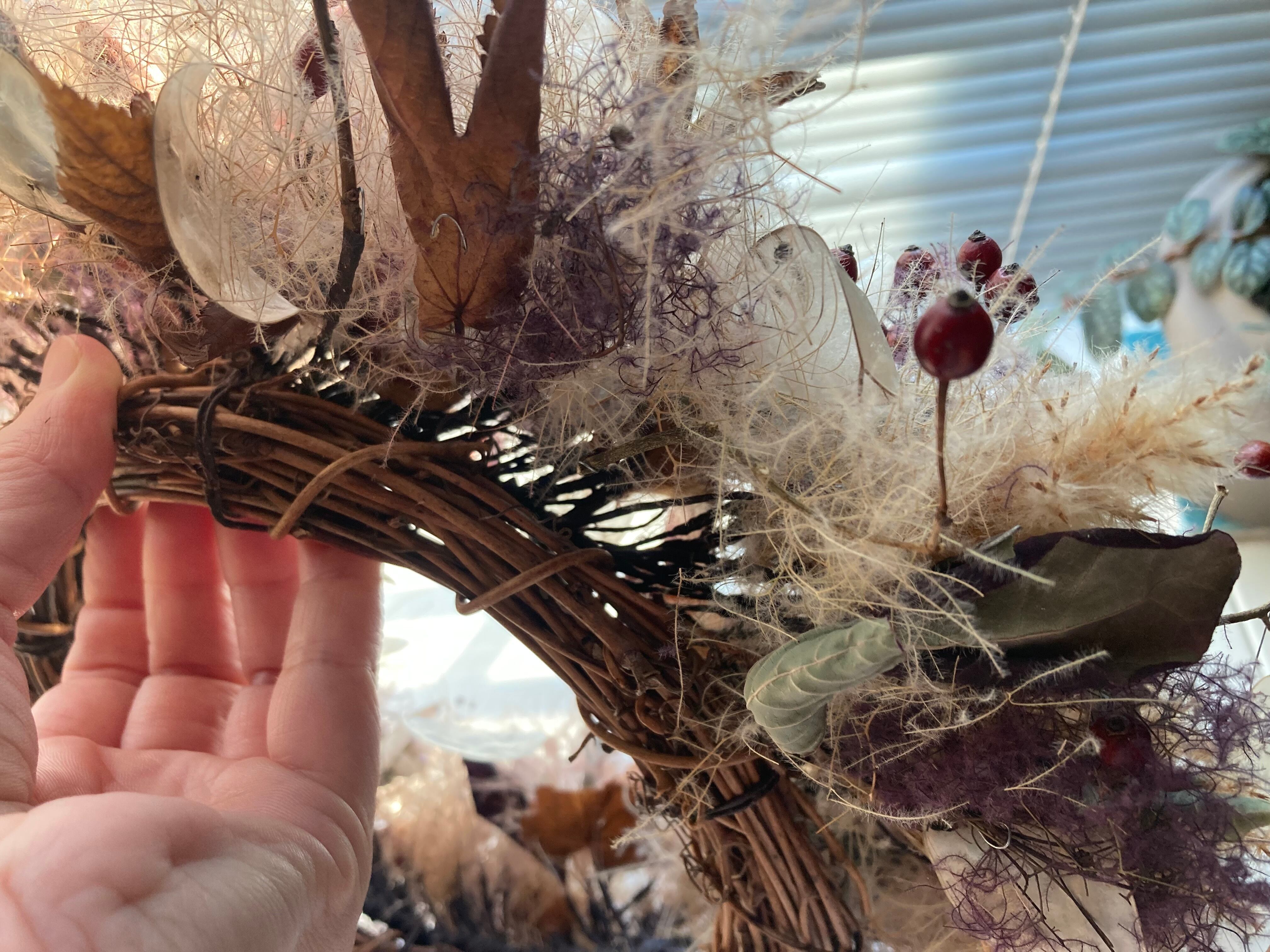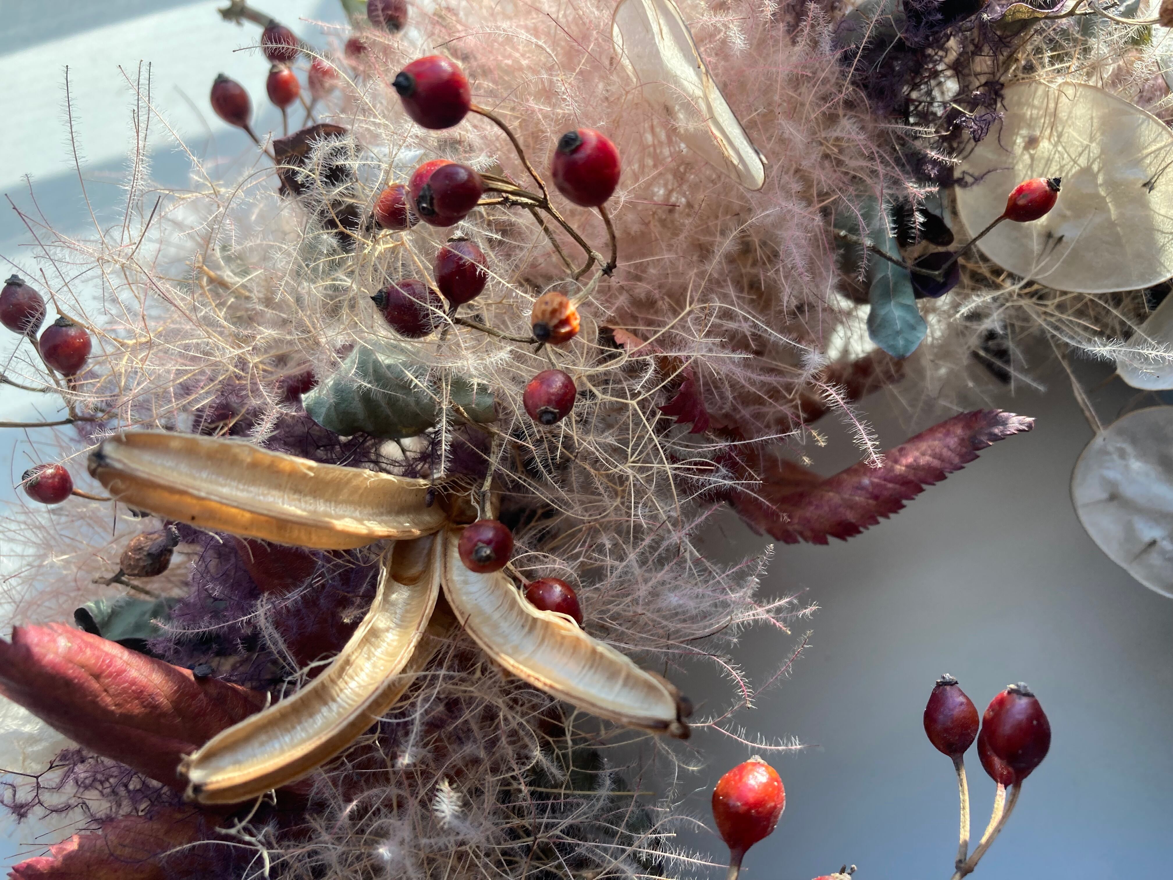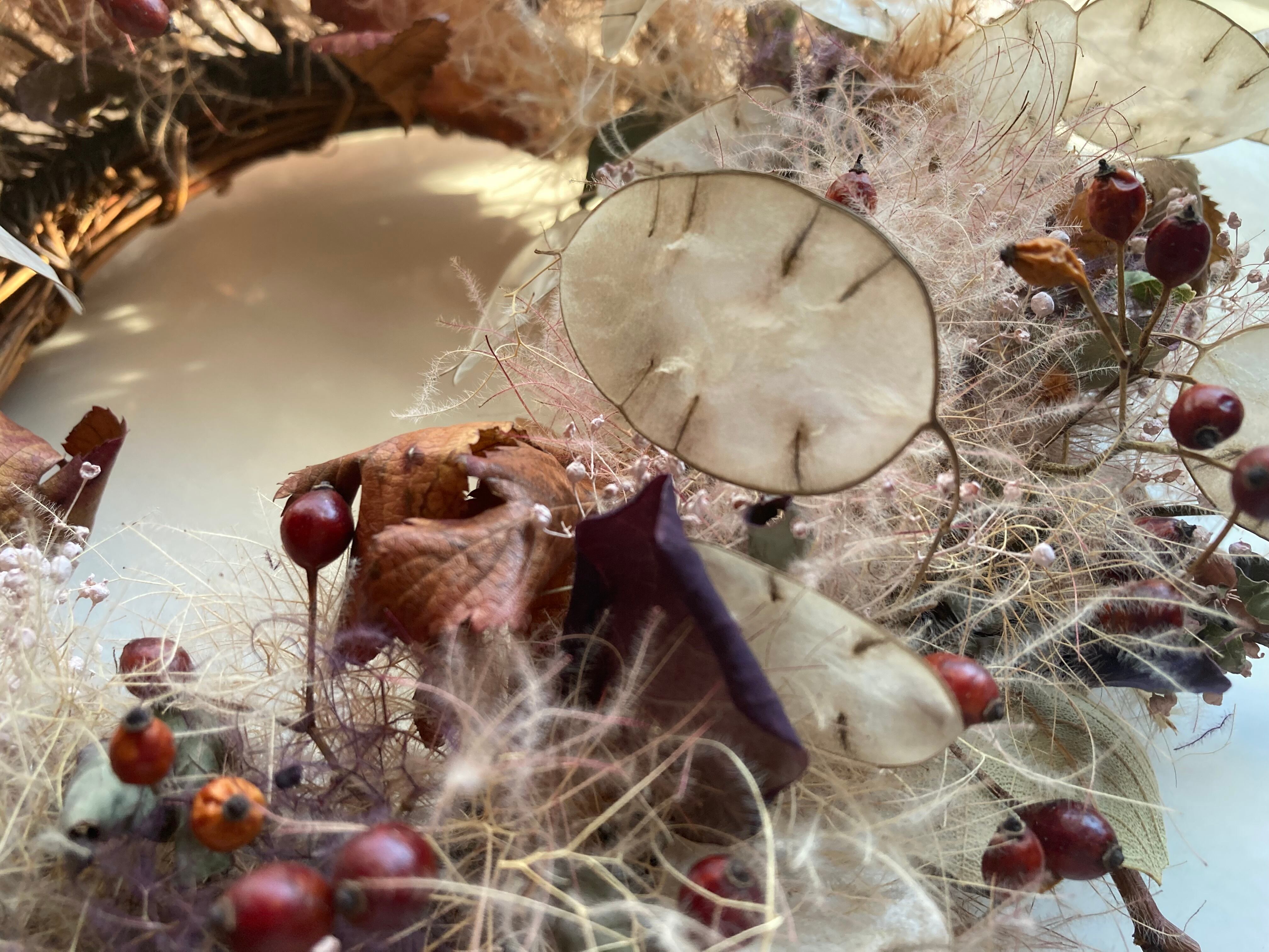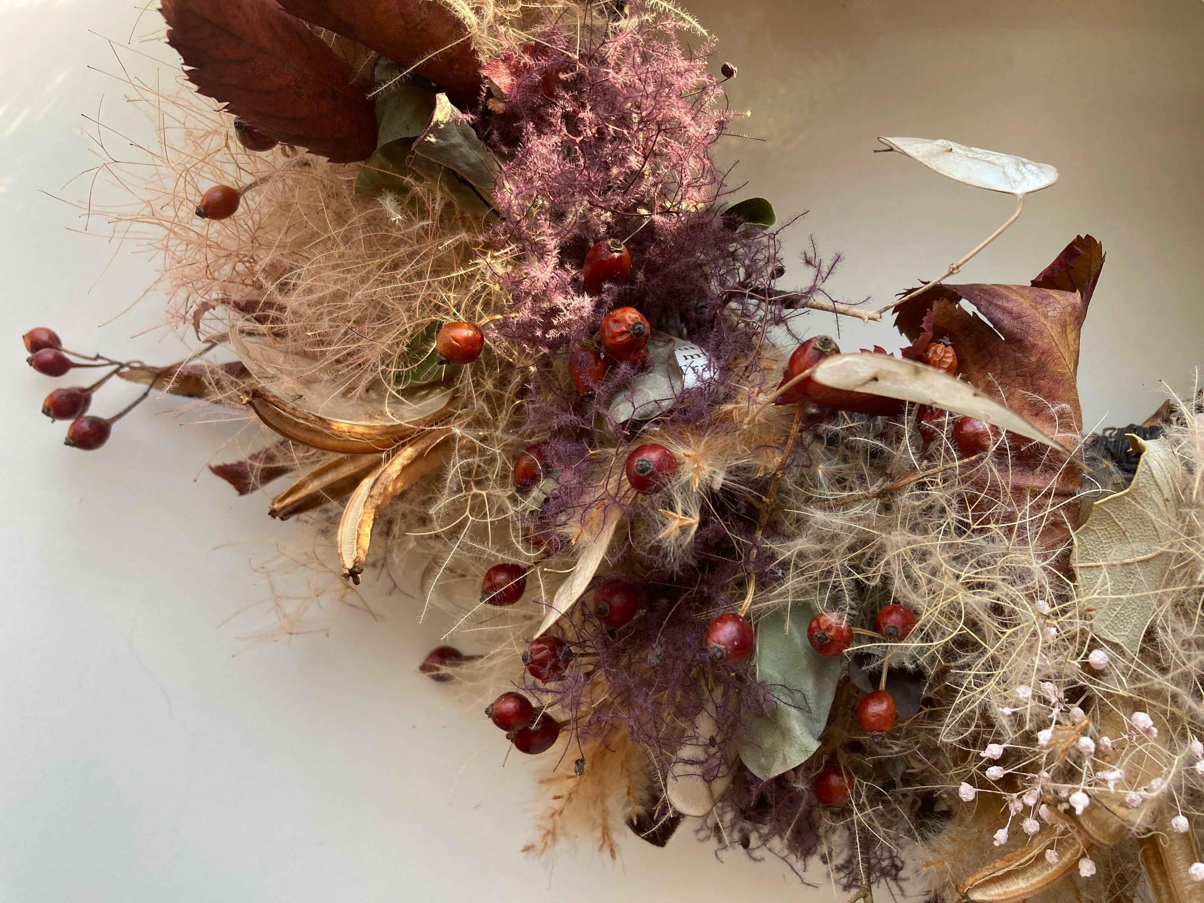 ★使用花材 / スモークツリー、ルナリア、ツルバラ、鉄砲百合の種、テールリード、キイチゴの葉、ソフトミニカスミソウ(プリザーブドフラワー)