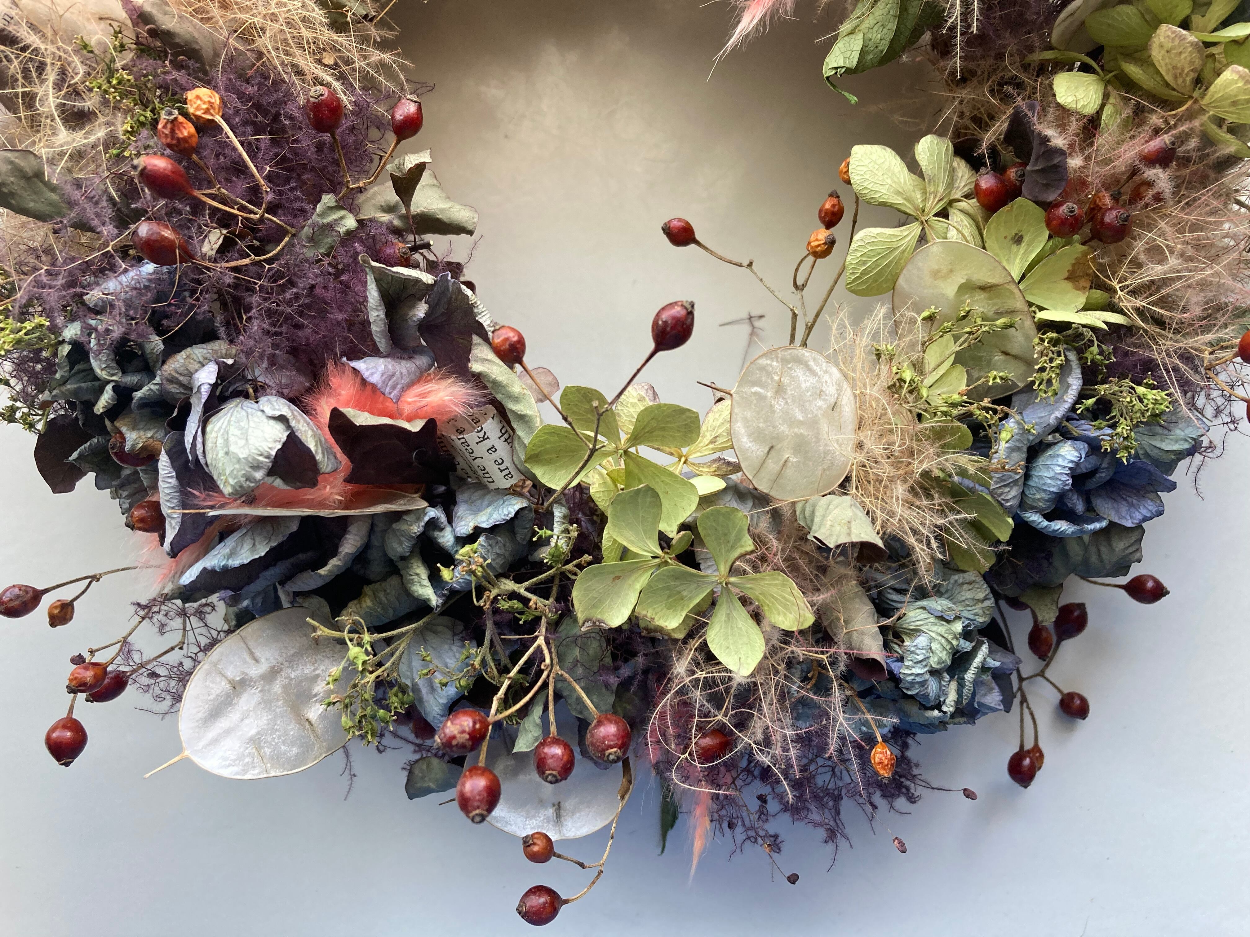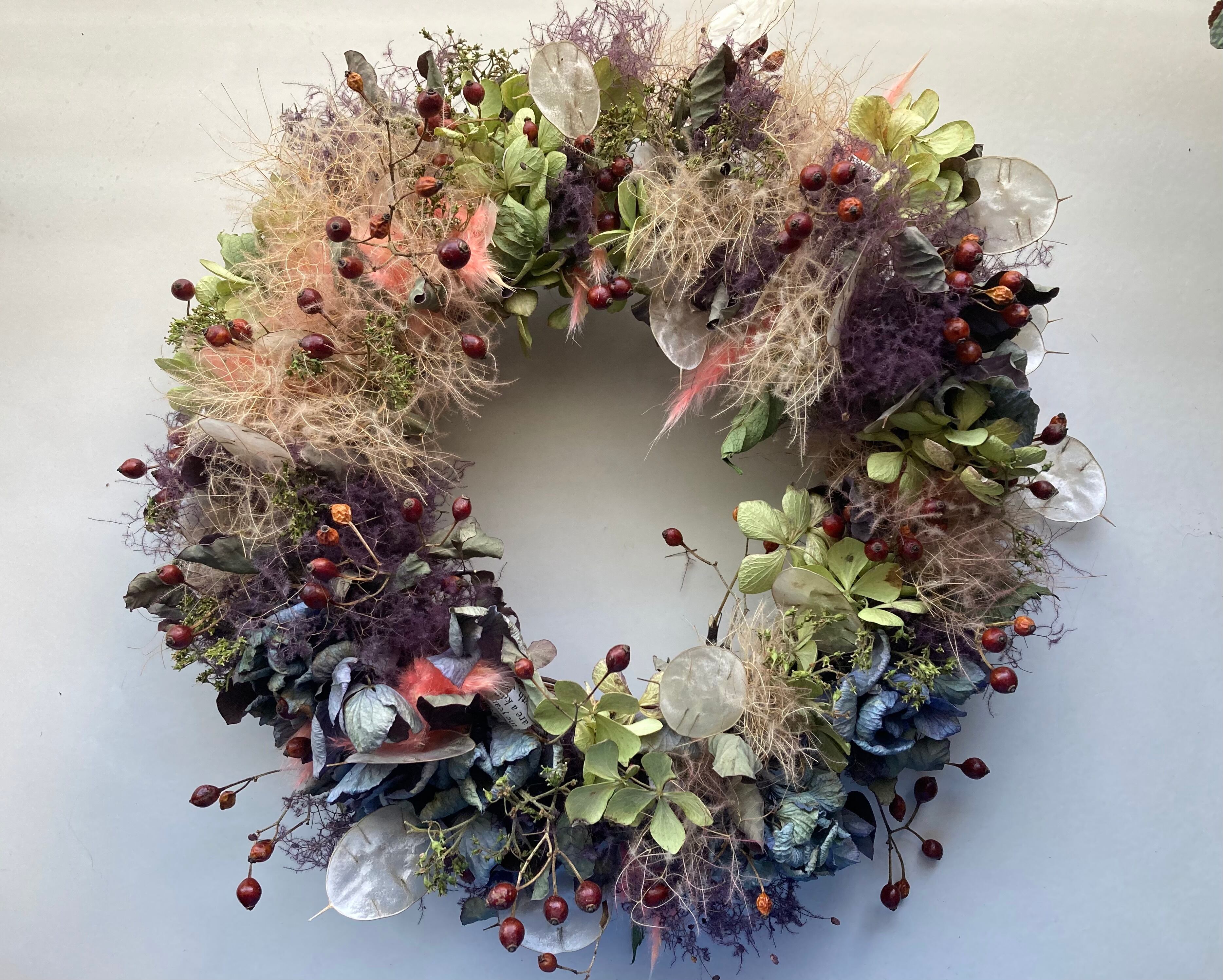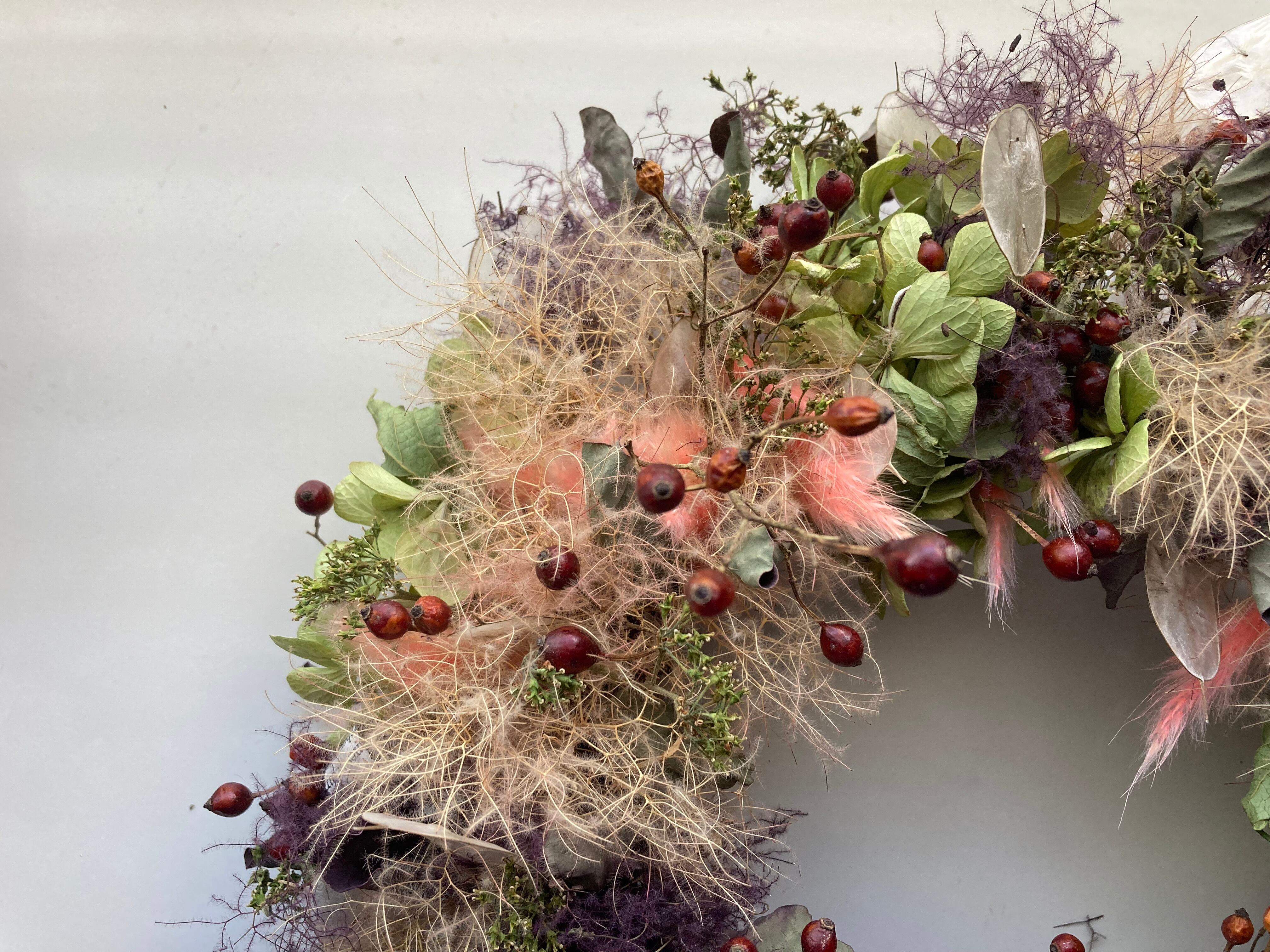 プリザーブドフラワー(一部)とドライフラワーを使ったオリジナルのリース(壁掛け)です。